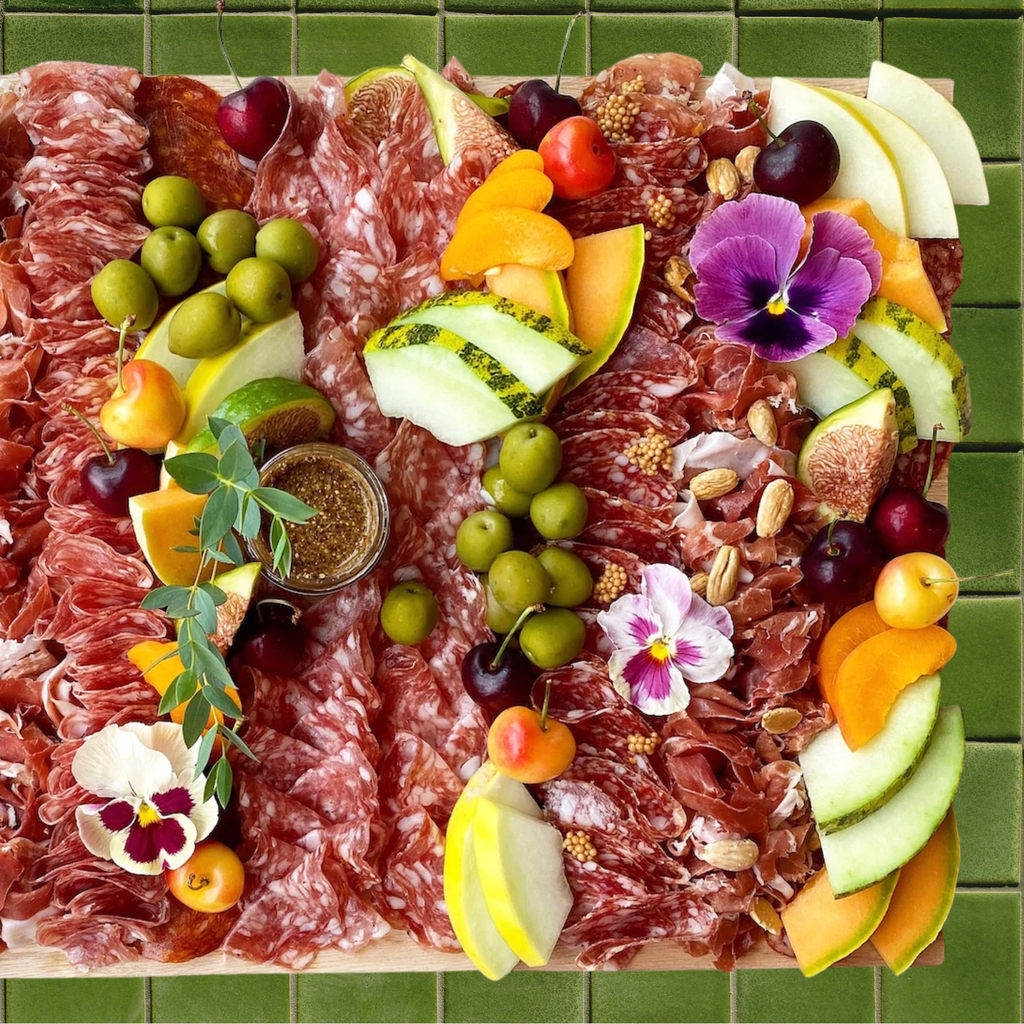 Our handcrafted charcuterie Board includes 4-5 Cured Meats, Seasonal Farmer's Market Fruit and/or Crudites, Whole Grain Mustard, and our favorite accompaniments like Olives, Cornichons, Pickled Mustard Seeds, Dried Fruit, Assorted Nuts and Seasonal Flower and Herb garnishes.