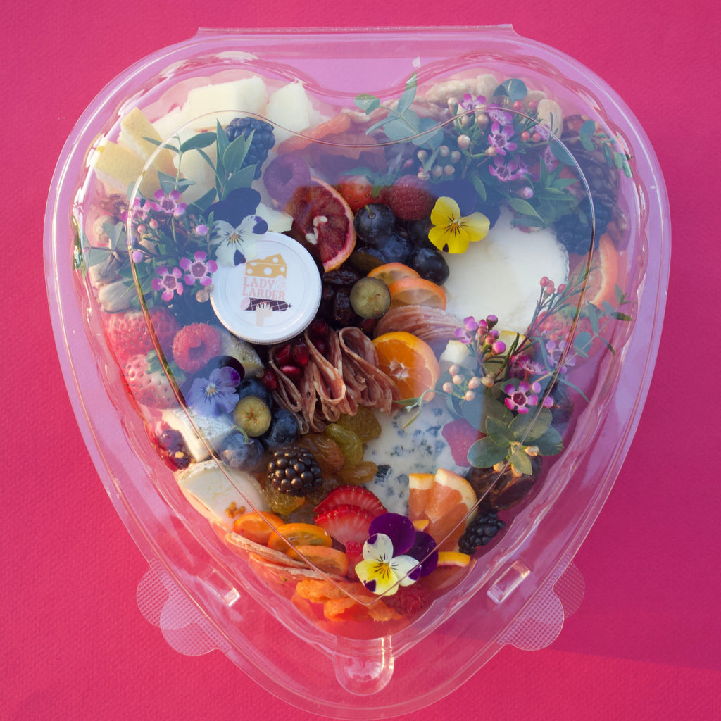 The PERFECT valentine. Our handcrafted Cheese & Charcuterie Valentine Box includes 3-4 Cheeses, 2-3 Cured Meats, Seasonal Farmer's Market Fruit, Malibu Honey and our favorite accompaniments like Olives, Cornichon, Pickled Mustard Seeds, Dried Fruit, Assorted Nuts and Seasonal Flower and Herb garnishes. Each order comes in a clear 9" heart shaped box.