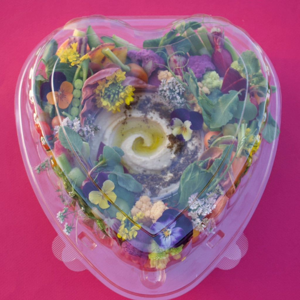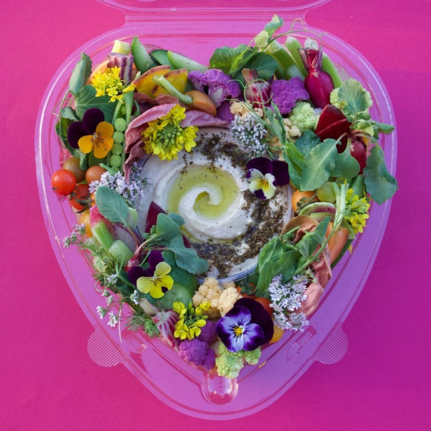 A selection of our favorite seasonal vegetables and hummus. All vegetables are sourced from Farmers Market. Hummus is topped with our magical za'atar blend and Olive oil. Comes in a clear 9" heart-shaped container. For the person in your life who deserves more than just a box of chocolate truffles. #sendcrudes